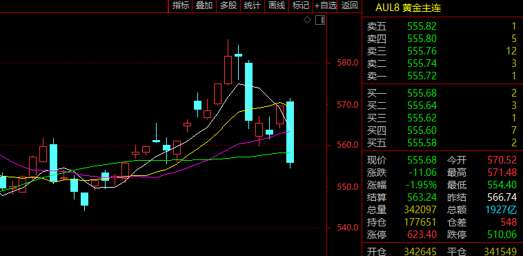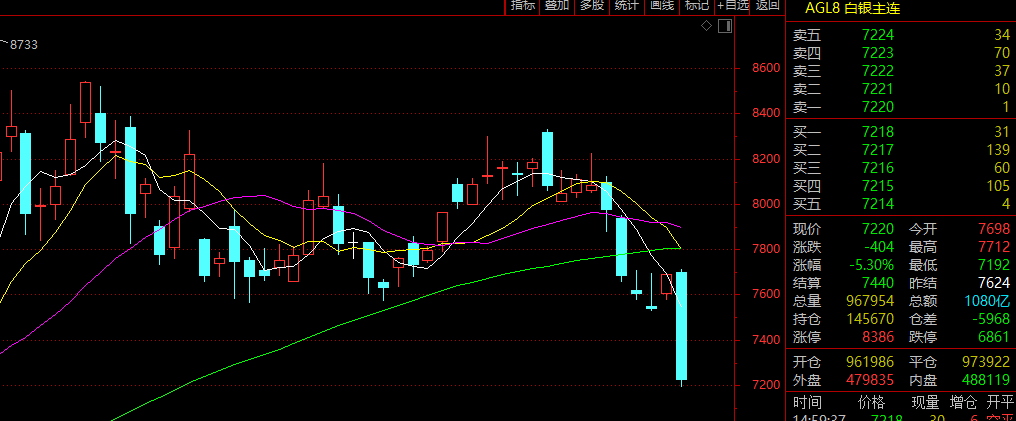 国际贵金属价格下行压力下,7月25日国内期货市场沪金、沪银出现大幅下行。截至下午收盘,沪银主力合约2408报跌5.3%,为近两个半月低点;沪金主力合约2410也报出1.95%跌幅,收于555.68元/克。